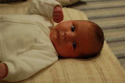 2. Colic: this past week he has been suffering a lot from colic and long stretches of non-stop crying. Thursday was the absolute worst, nothing we did would stop him from crying. I was so desperate, I called his doctor, who very calmly said that it was colic and that I needed to be patient and give him lots of love. Easy for him to say, he didn't have a ballistic baby to calm down!! My back and shoulder were (are) aching from carrying him around in the Baby Bjorn, which was the only way to settle him and get him to sleep some.
